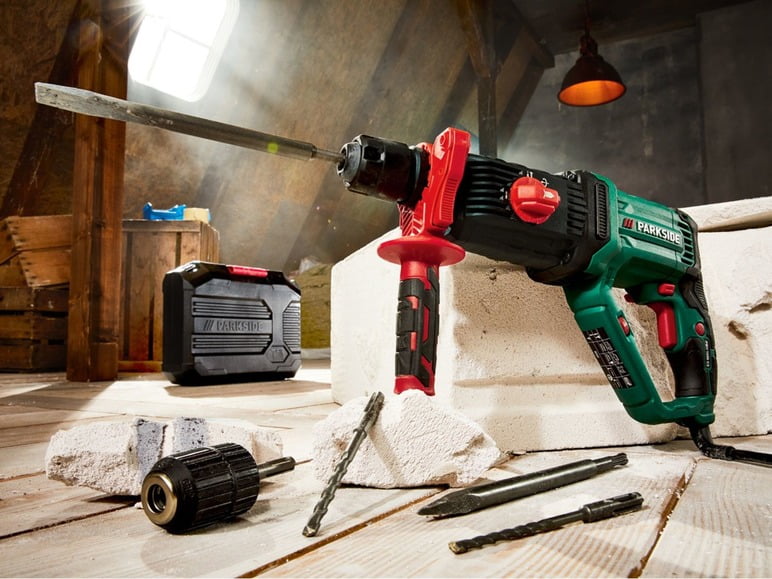 دریل بتن کن پارکساید parkside pbh 1050 B2 برای کار قدرتمند با مواد چکش پنوماتیک بتونی ، سنگی ، فلزی یا چوبی با نگهدارنده ابزار مقاومت در برابر ضربه بالا مطابق با سیستم SDS Plus سوئیچ انتخابی مرکزی برای همه عملکردها: پیچ یا مته مودم Zugesc به کاربران امکان می دهد مکانیزم چکشی برای اسکنه ها و حفاری چکشی موقعیت اسکنجه را تنظیم کنند