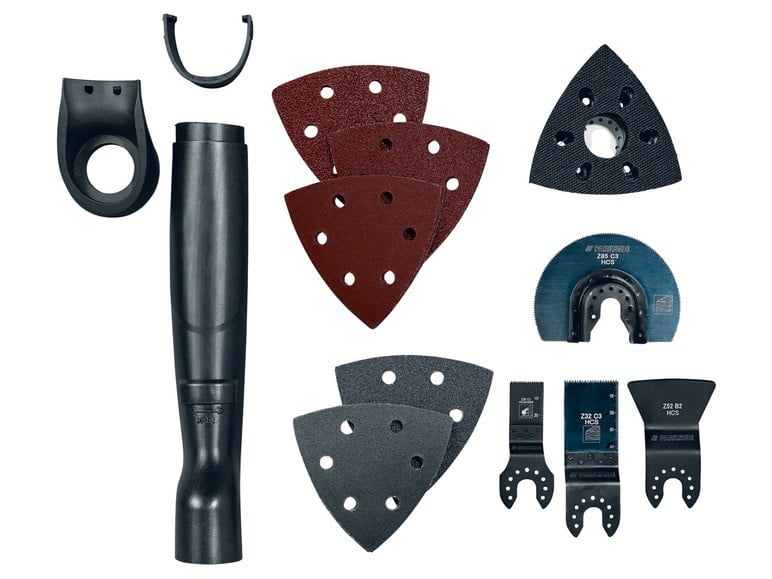 2 تیغه اره غرق شدنی، 1 تیغه اره بخش، 1 چاقو برنامه ریزی، 1 صفحه شن دلتا، 18 تیغه شن و ماسه، 1 کانال استخراج گرد و غبار