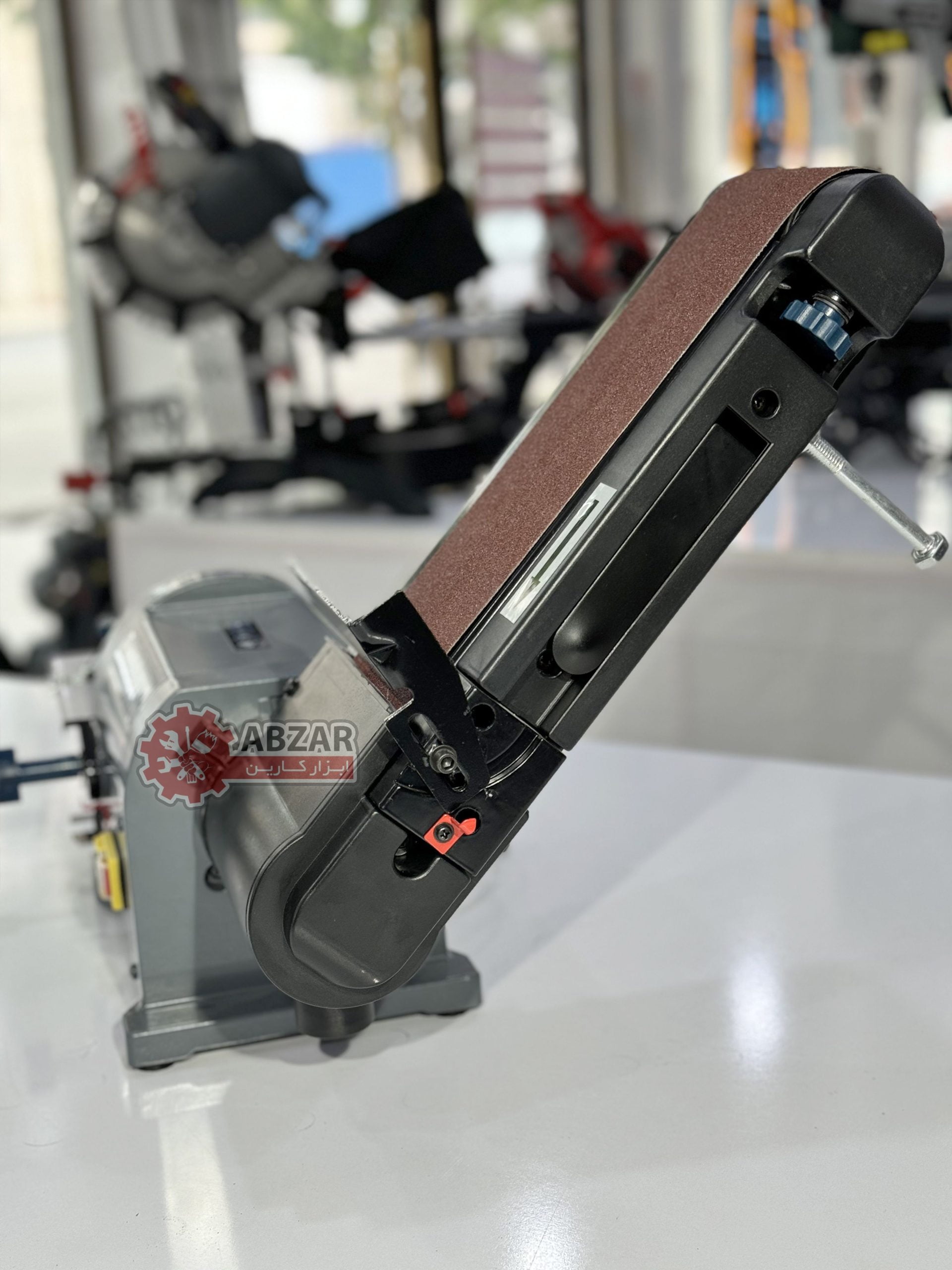 صفحه سنباده تسمه نیز از معجون افقی به عمودی حرکت می کند، فقط دو پیچ پیچ درپوش شش گوش را با یک کلید شش گوش که در زیر پوشش تسمه محرک قرار دارد، باز کنید.
