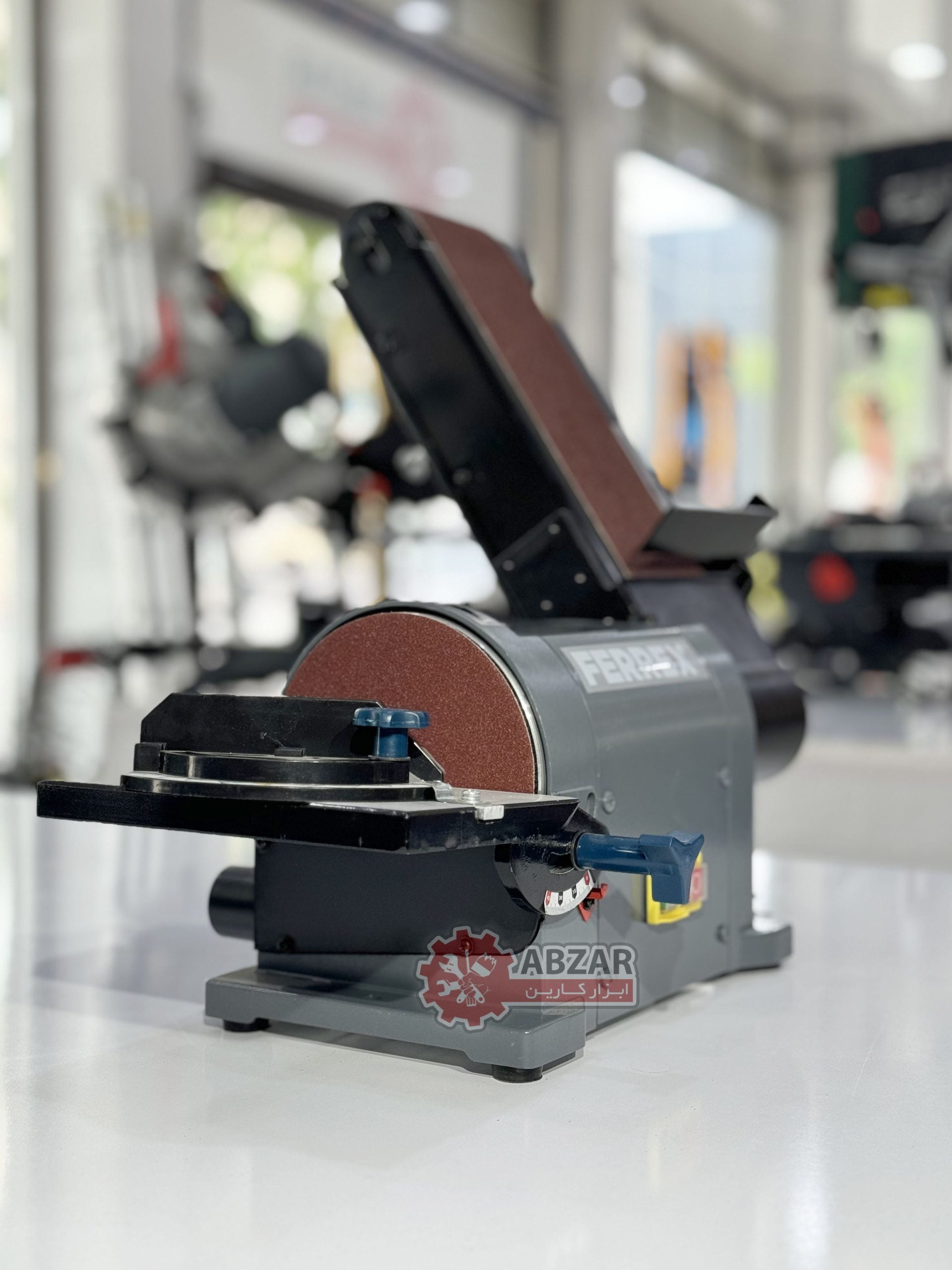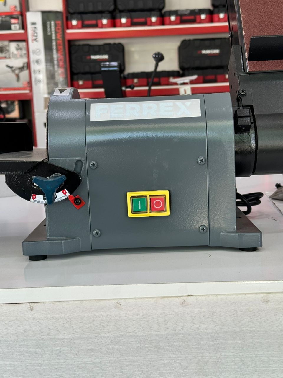 که از 0 درجه به 45 درجه می چرخد. این میز دارای یک حصار میتر است که در شکافی برای سنباده زنی اریب و زاویه مرکب اجرا می شود. میز به راحتی از تسمه به عملکرد دیسک منتقل می شود.